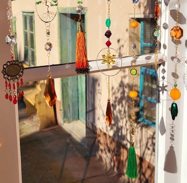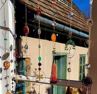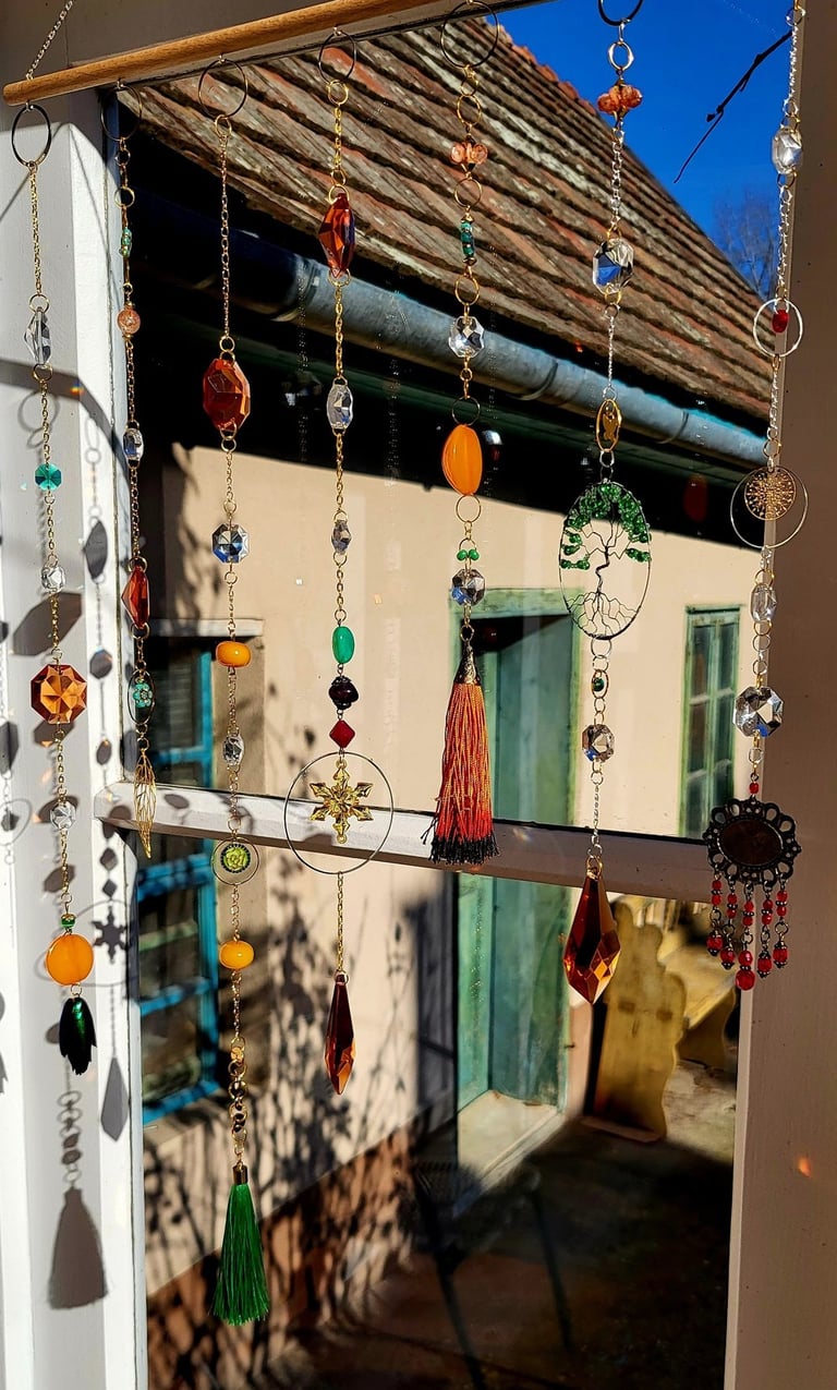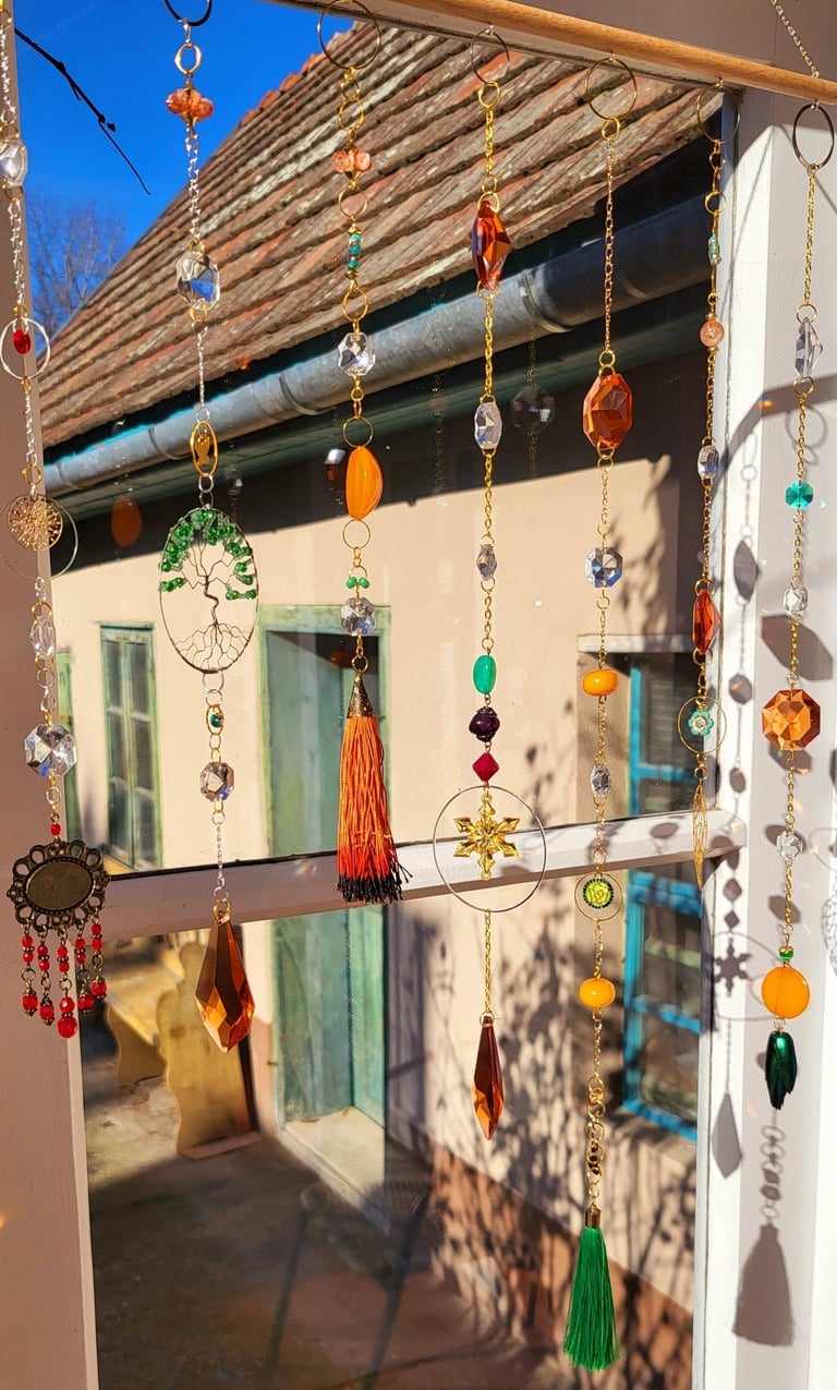 Bőségfogóim az évek során gyűjtött "kincseim" kombinációi; a régi, már nem javítható csillárokból származó kristályok, a régi bizsuk, amelyeket szétszedek és új kombinációban rakok össze, színes ásványok; mind olyan szimbólumok, amelyek ősidők óta a boldogság, a szeretet és a bőség érzését keltik az emberekben.