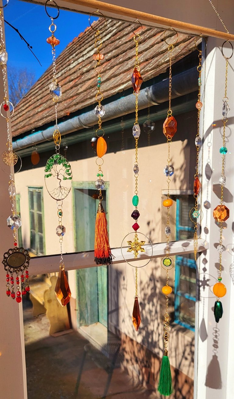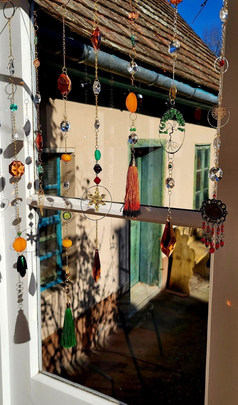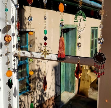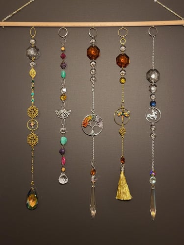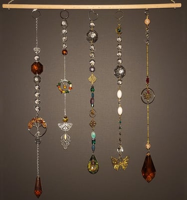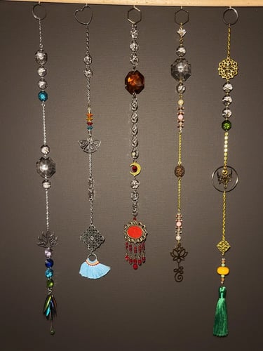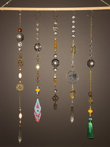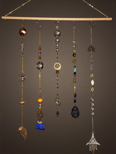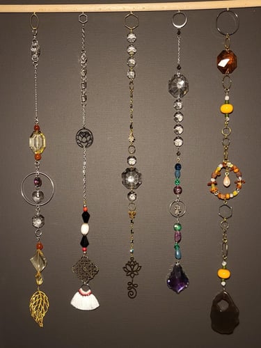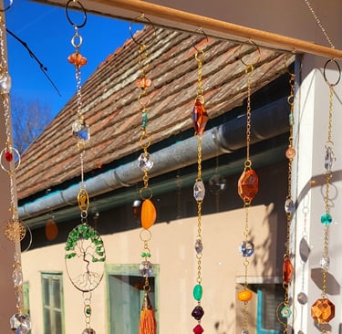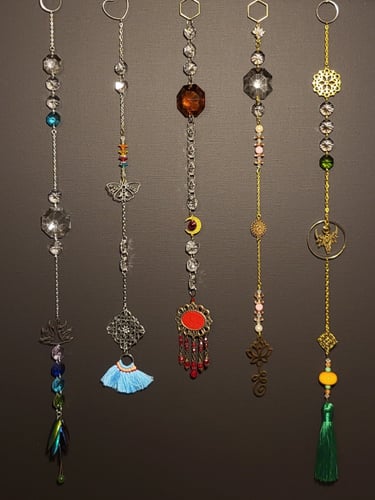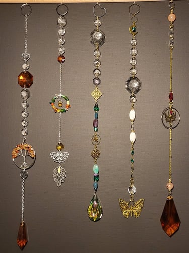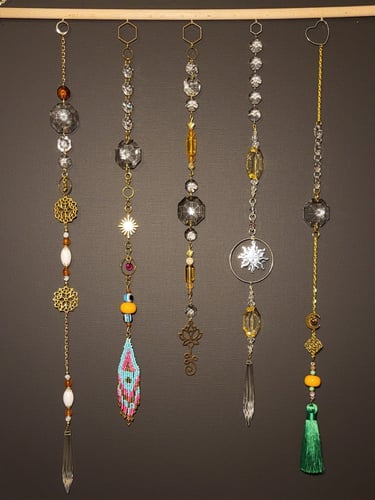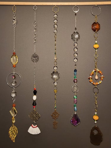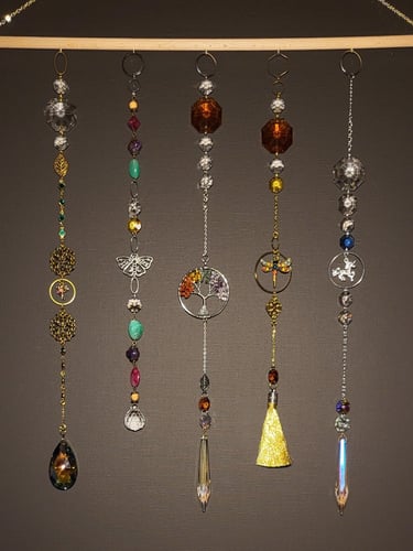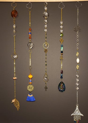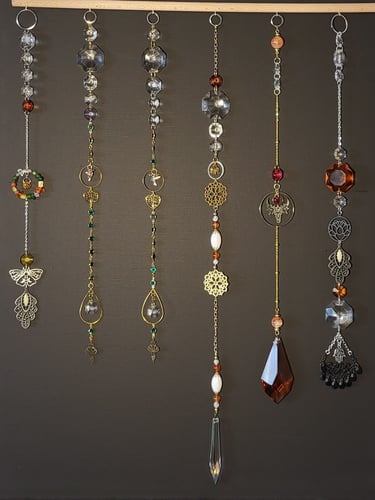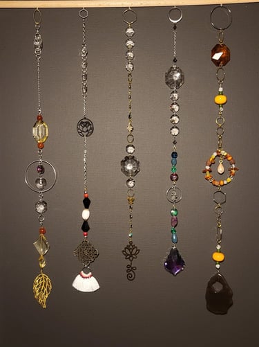 Lapače hojnosti jsou kombinací pokladů, které jsem nasbírala ať jsou to křišťálové skla z již nefunkčních lustrů, šperky, které rozmontuju a složím do nových kombinací, barevných minerálních kamenů, symbolů, které v nás od pradávna vyvolávají pocit štěstí, lásky a hojnosti. Jsou kombinací starého, co má svoji originální hodnotu a nového co vše osvěží. Jejich tvoření si nesmírně užívám, miluju skládat dohromady kousky, které byly daleko od sebe a najednou to vypadá, že jsou stvořeny pro to, aby se potkali a vytvořili harmonický celek. Každý kus je originál, protože, když tvořím tvořím spontánně.